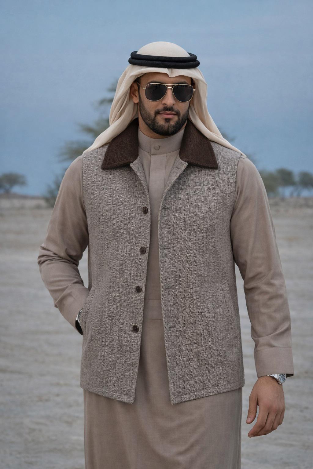 سديري أنيق رجالي مصنوع من قماش الجوخ ذات غولة مزدوجة باللون البني